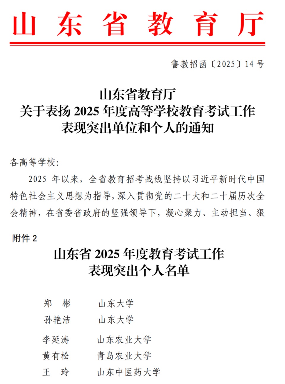 近日,山东省教育厅发布《关于表扬2025年度高等学校教育考试工作表现突出单位和个人的通知》(鲁教招函〔2025〕14号),对在2025年度全省教育考试工作中做出突出贡献的单位和个人予以通报表扬。我校研究生处黄有松同志荣列“表现突出个人”名单。